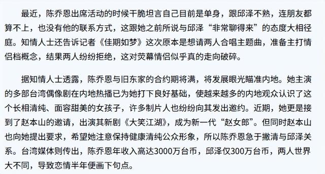 但后来陈乔恩在出席活动的时候,自称单身和邱泽不熟。
