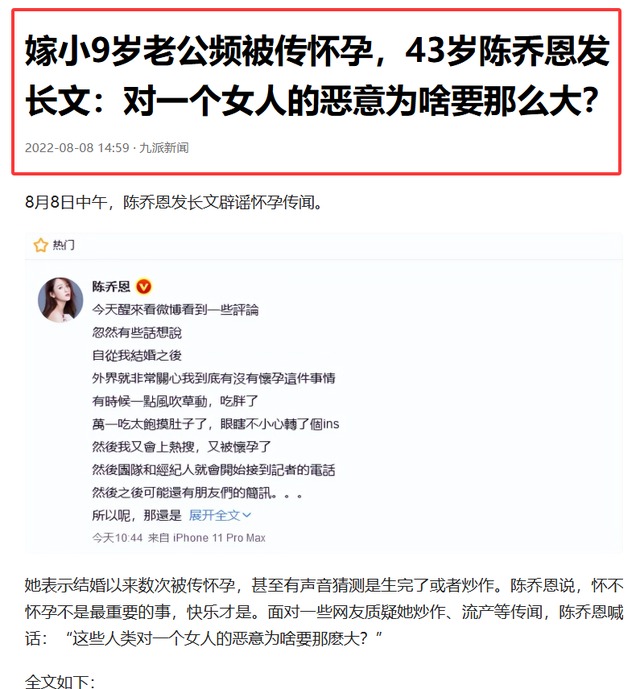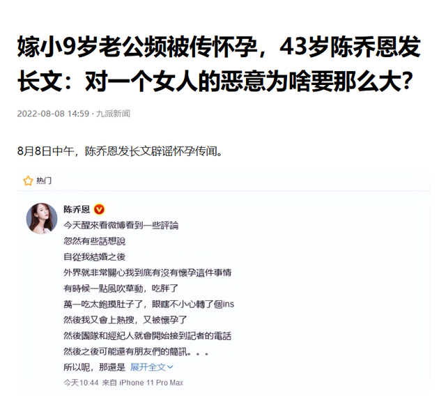甚至有人还说陈乔恩就是借怀孕一说炒作,后来她还专门发文辟谣。