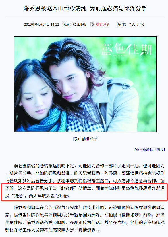 有人称陈乔恩为了当“赵女郎”,“斩断”了她和邱泽之间的缘分。
